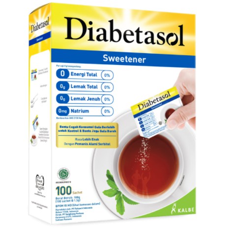 Diabetasol Sweetener merupakan pemanis alami dengan kandungan nol kalori untuk bantu jaga gula darah. Dengan kandungan yang tingkat kemanisannya 600x dibandingkan gula tebu (gula pasir) serta rasa manis yang tidak berubah pada suhu panas dan dingin, sehingga dapat digunakan untuk teh, kopi, jus, memasak bahkan membuat kue. Aman bagi penyandang diabetes dan orang yang perduli terhadap kesehatan.