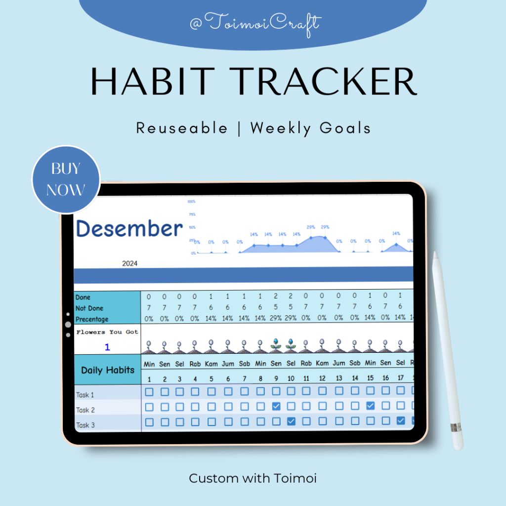 Ciptakan pola hidup lebih teratur dan konsisten dengan Habit Tracker ini. Dapatkan sekarang dan mulai perjalanan menuju versi terbaik diri Anda!