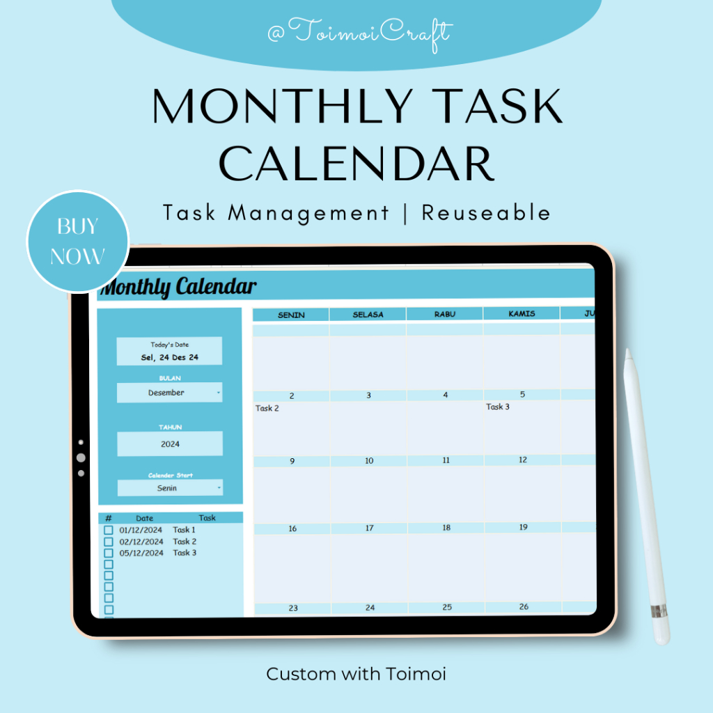 Nikmati kemudahan mengatur jadwal dengan Monthly Task Calendar, kalender digital praktis yang membantu Anda tetap produktif setiap bulan!