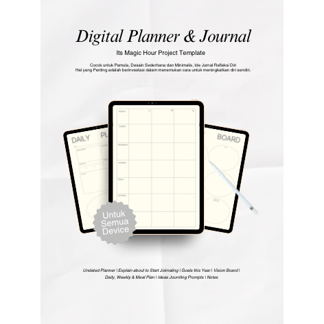 Hi! This is Its.Magic.Hour Project for Digital Planner & Journal (Indonesia - English Version) digunakan untuk mengeksplorasi pikiran dan perasaanmu, melatih produktivitas dari to-do list/ daily task yang berguna untuk emosional kamu. Dengan adanya Digital Planner ini bisa bikin rutinitas bangun tidur & sebelum tidur yang asik, gunanya jurnal prompts untuk bantu kamu yang mau nulis.
