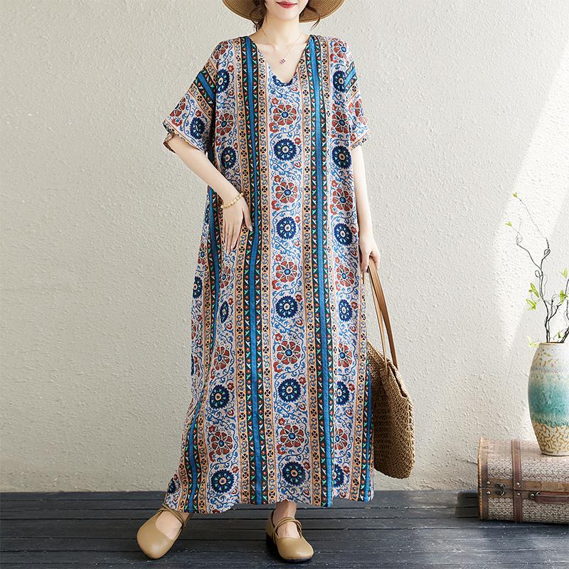 Dimanaf 2024 Платье больших размеров, новое летнее тонкое базовое женское платье с v-образным вырезом, свободное винтажное длинное льняное платье с короткими рукавами One Size синий