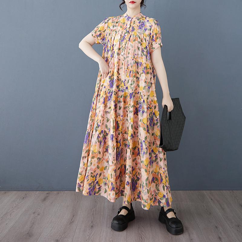 Dimanaf 2025 Женское Длинное Платье Большого Размера Весна Лето С Принтом Повседневное Платье Свободное Базовое Макси Новое Винтажное One Size оранжевый
