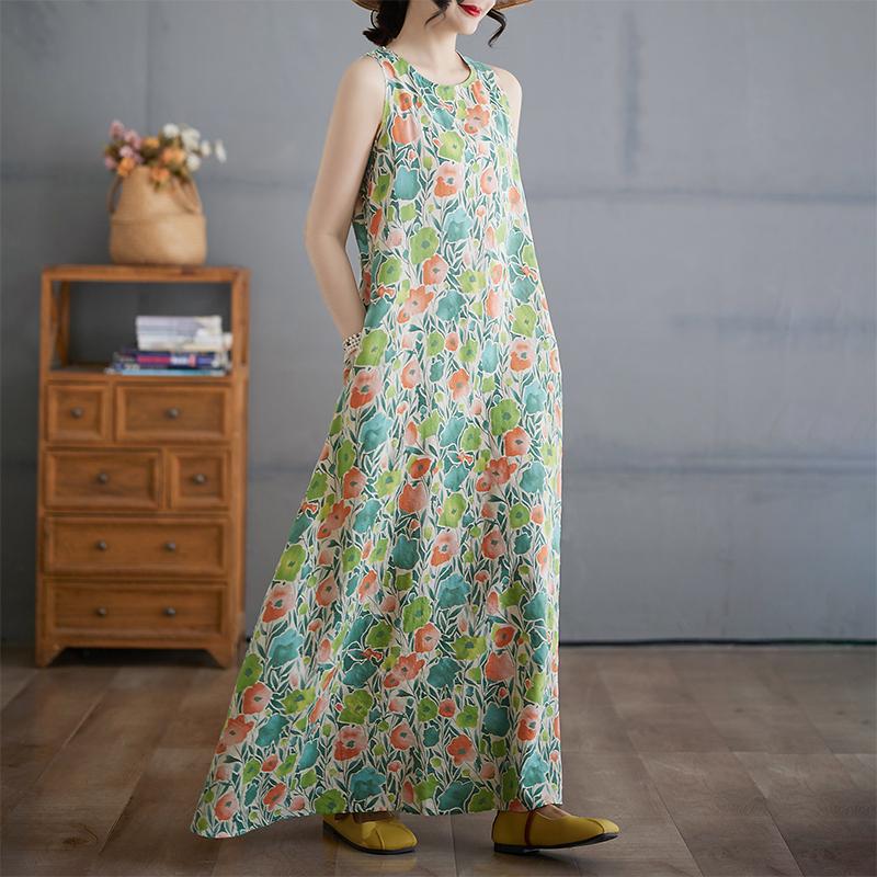 Dimanaf 2025 Женское льняное летнее платье с цветочным принтом, повседневное женское базовое длинное платье 8082 2XL
