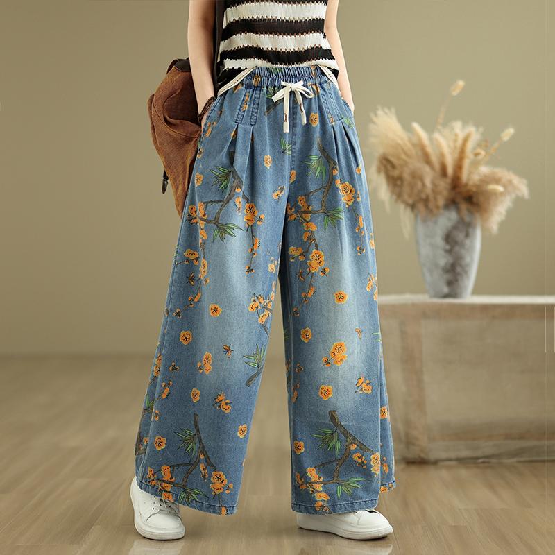 DIMANAF 2025 Летние джинсы больших размеров, длинные брюки, женские повседневные эластичные базовые свободные широкие брюки с цветочным принтом и высокой талией 2XL