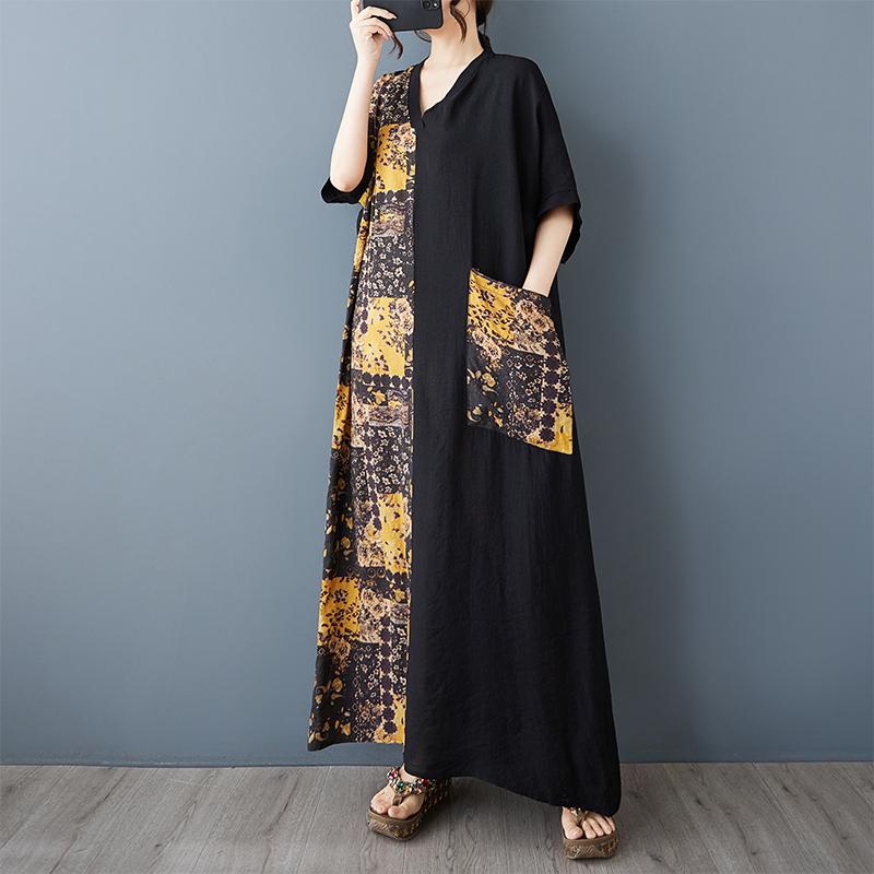 Dimanaf 2025 Лето Плюс Размер Новое Пляжное Платье Базовое Свободное Женское Повседневное Платье С Принтом V-образным Вырезом Длинное Винтажное Платье Макси One Size жёлтый