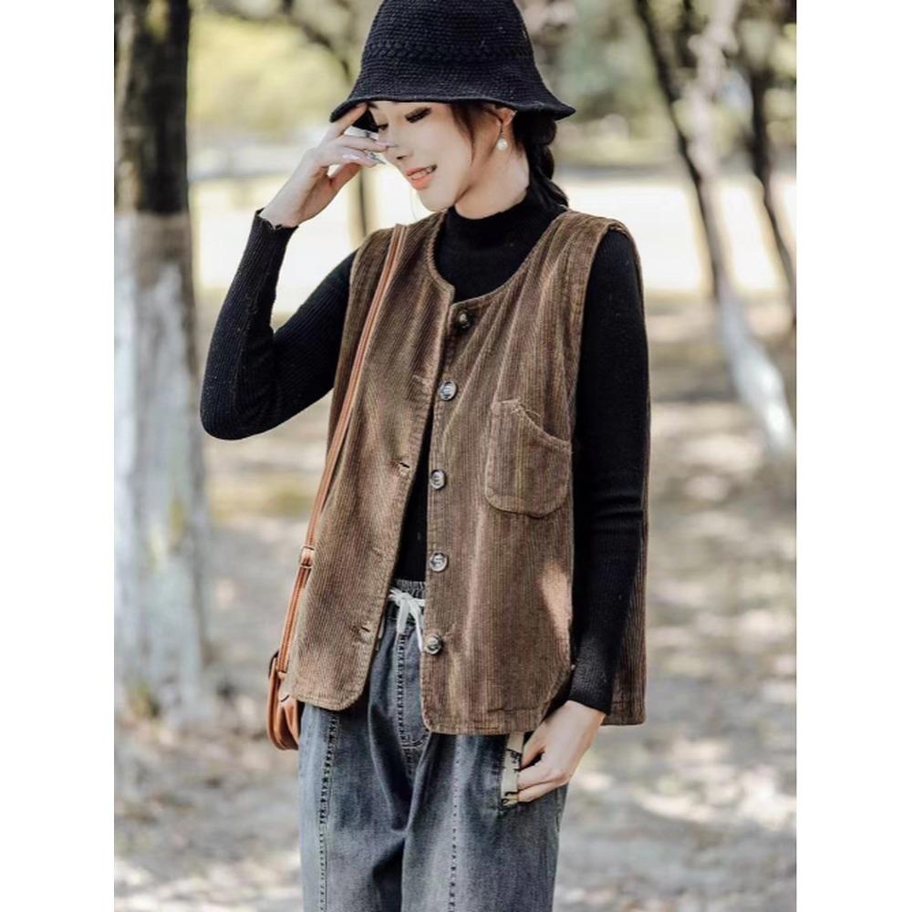 Dimanaf 2025 Новая короткая вельветовая куртка-жилет Осень Без рукавов Ретро пальто Серые пуговицы Женская однотонная One size