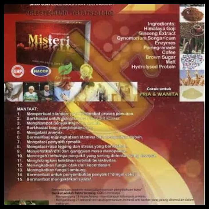 Himalaya Goji, Ginseng Ekstrak, Cynomorium Songaricum, Enzymes, Pomegranade, Coffee, Brown Sugar, Malt, Hydrolysed Protein.