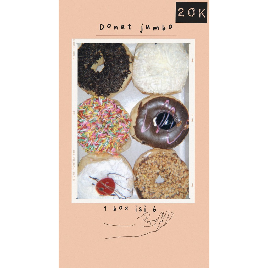 1 box donut jumbo isi 6 dengan berbagai macam varian rasa dengan tekstur yang sangat lembut juga topping yang nikmat