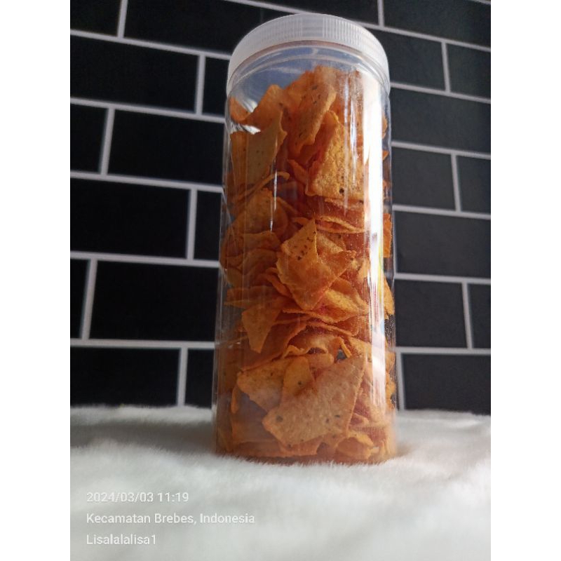 ready Doritos kemasan toples 100% kualitas asli terbuat dari keripik jagung rasa BBQ gurih dan renyah cemilan sambil ntn TV bersama keluarga
