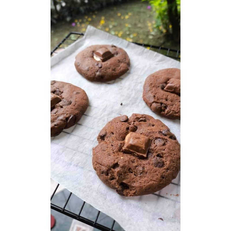 Soft cookies double choco dengan tekstur yang lembut dan chewy, serta potongan cokelat meleleh di dalamnya.