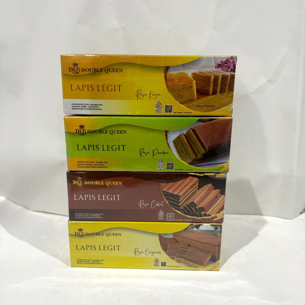 Lapis Legit yang sempat VIRALLL di sosial media. Ada 4 varian rasa: Original, Sarikaya, Pandan, Coklat. Double Queen Lapis Legit mempunyai tekstur yang lembut, lapisan yang rapi, dan rasa yang sangat lezatttt. Sangat cocok sebagai sajian spesial di hari raya, maupun sebagai pendamping minum teh/kopi di waktu santai. Hadiah yang elegan untuk orang tercinta, kolega, maupun relasi bisnis.