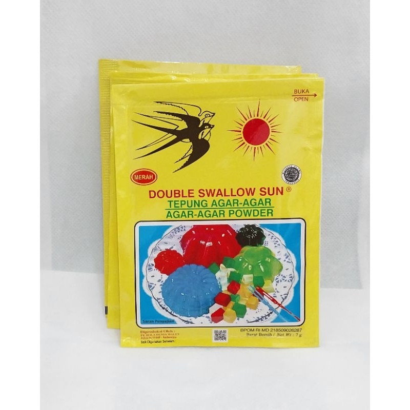 Tepung Agar-Agar Double Swallow Sun 7 Gram PT Bola Dunia Wallet Halal MUI & BPOM Enak. Tepung agar-agar berserat tinggi diolah dari sari rumput laut asli.
