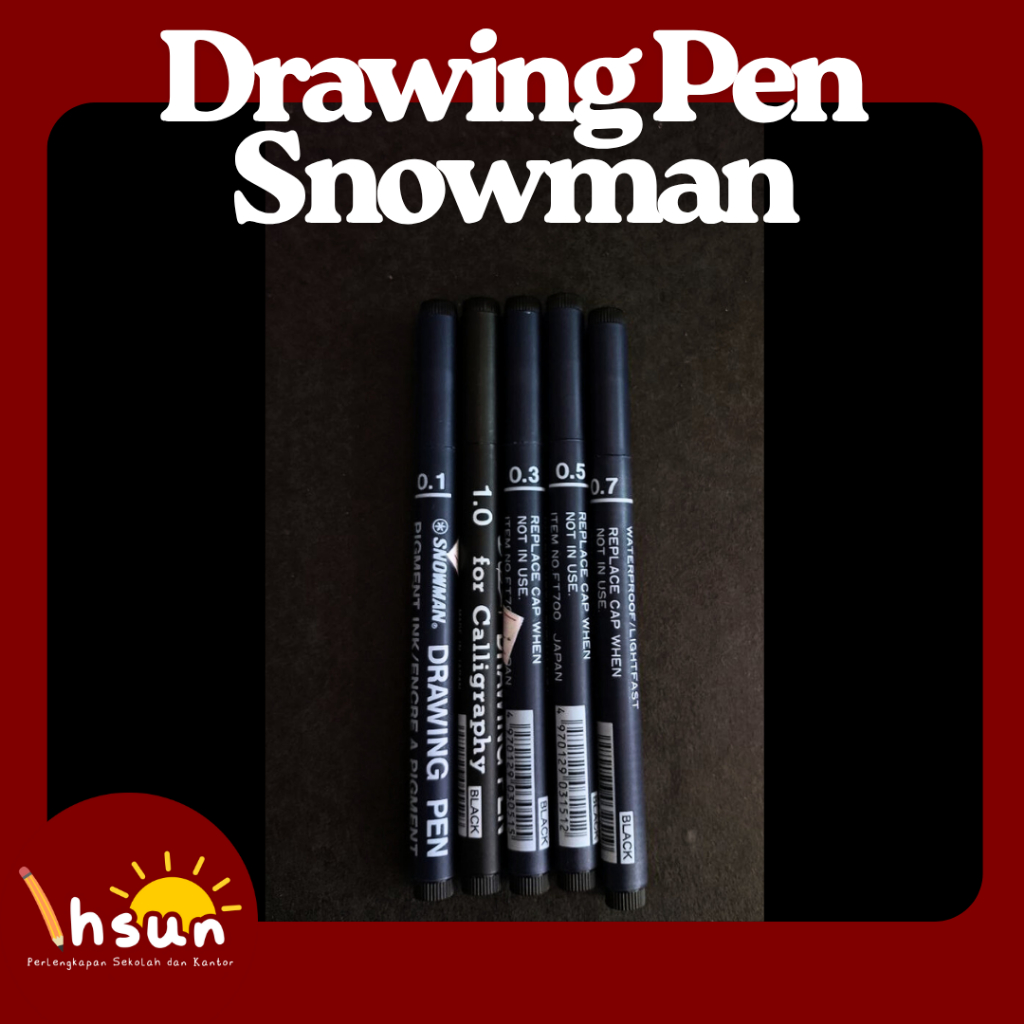 Drawing Pen Snowman adalah pena gambar teknis yang dirancang untuk kebutuhan ilustrasi, sketsa, dan kaligrafi. Pena ini menggunakan tinta pigmen berwarna hitam yang tahan air (waterproof) dan tidak mudah pudar (lightfast). Pena ini memiliki tutup dengan klip dan tersedia dalam berbagai ukuran ujung (nip) yang berbeda, seperti 0.1, 0.3, 0.5, 0.7, dan 1.0, sesuai kebutuhan pengguna.