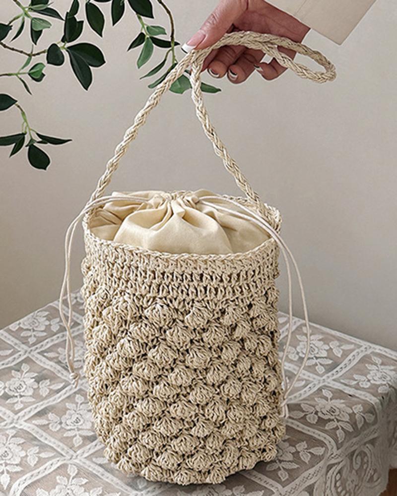 Drawstring Braided Bucket Straw Bag, Beige