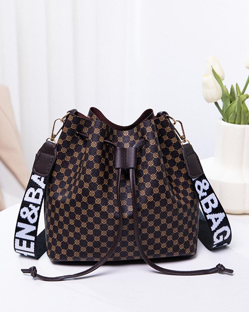 Drawstring Letter Band Bucket Bag, Coffee