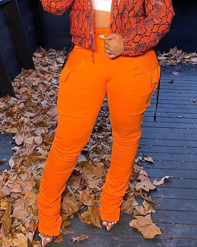 Drawstring Pocket Design Ruched Pants, Orange