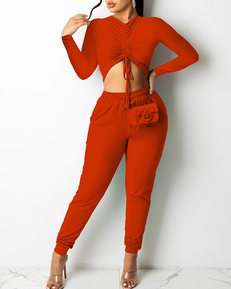 Drawstring Ruched Crop Top & Pocket Pants Set, Red