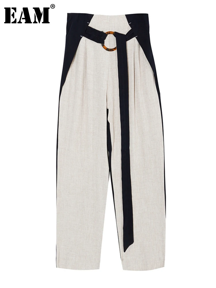 [EAM] брюки с высокой эластичной талией цвета хаки, с поясом, новые свободные брюки, женские модные брюки, весна-осень 2023, 1DF5209