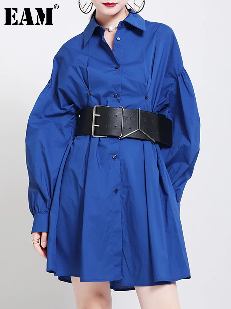 [EAM] женское асимметричное платье большого размера с синими пуговицами, новое свободное платье с отворотом и длинным рукавом, весна-осень 2022,...