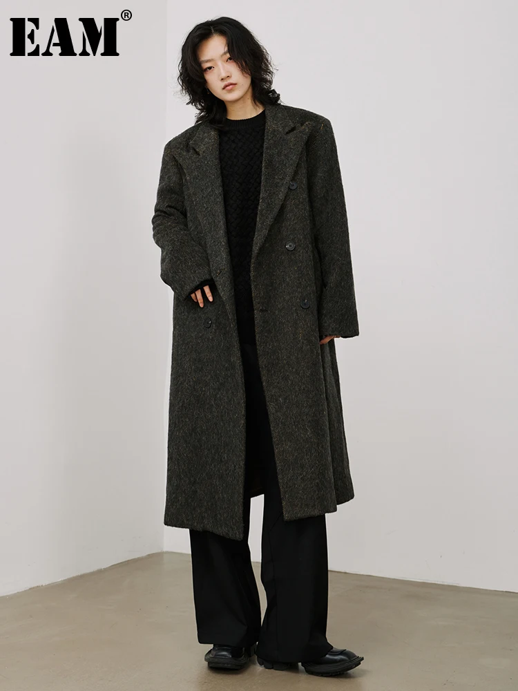 [EAM] свободное темно-зеленое шерстяное пальто большого размера, новая женская куртка с отворотом и длинным рукавом, модная осенне-зимняя 2023 1DH0060