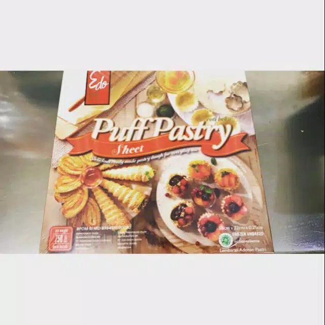 Puff Pastry Edo 750 gram isi 4 sheet kisaran 20 cm x 20 cm atau per sheet dengan ukuran 88 cm x 22 cm x 0.25 cm merupakan lembaran adonan puff pastry siap pakai yang terbuat dari bahan berkualitas sehingga menghasilkan adonan pastry yang lembut dan gurih.