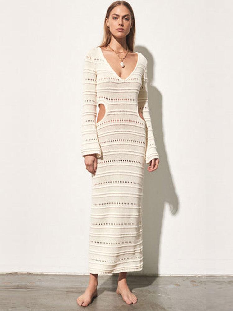 EDOLYNSA Белая туника с V-образным вырезом и рукавами-колокольчиками, вязаная крючком, облегающая, платья-свитера для отпуска, пляжная одежда для летней вечеринки, сексуальное пляжное платье макси L бежевый