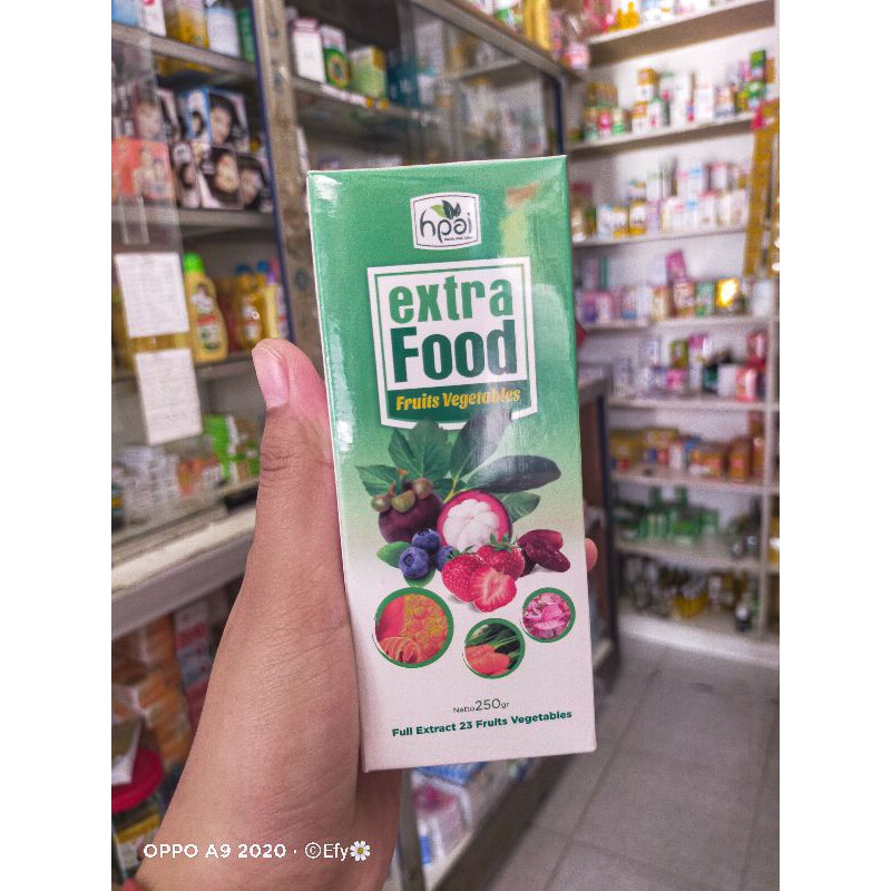 Extrafood Extra Food HPAI minuman kesehatan ekstrak dari 23 herbal buah-buahan dan sayuran yang memiliki banyak sekali khasiat serta manfaatnya. Extra Food HPAI dapat digunakan sebagai suplemen kesehatan oleh kita yang sedang sehat agar selalu terjaga kesehatan tubuh ini. Untuk yang sedang sakit, tentunya extra food dapat digunakan sebagai obat herbal yang dapat menyembuhkan berbagai penyakit. Extra food sangat berkhasiat untuk mengobati muntaber dan kekurangan gizi pada anak. Extrafood mengandung nutrisi dari bahan-bahan alami, tanpa pengawet maupun zat kimia sintetik shg aman dikonsumsi anak-anak dan dewasa bahkan orang tua. Kandungannya : kurma, madu, bee polen, royal jelly, beras hitam, rosella ungu, blackberry, blueberry, daun ashitaba, kulit manggis, daun sirsak, anggur hitam, black plum, spirulina, daun stevia, bayam merah, wortel, curcuma, zaitun, meniran, habbatussauda, rosella merah, dan strawberry.