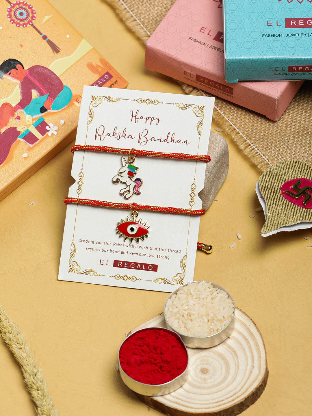 EL REGALO Set Of 2 Charm Detail Rakhis With Roli Chawal & Card, Red