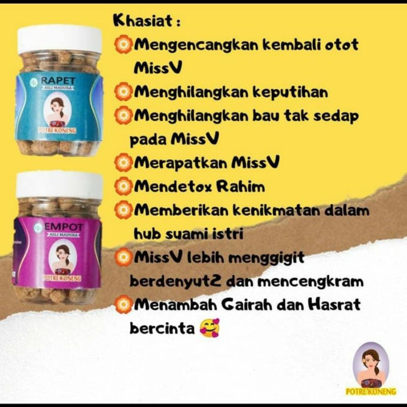 empot = dapat menimbulkan denyut denyut yg sangat instimewa saat berlangsungnya berhub*ngan suami istri , memberikan sesuatu yang lebih dari di inginkan oleh suami, menghilangkan lendir lendir di vag*na, menolong wanita dalam menimbulkan kembali gairah sex yang menyala nyala, semakin di sayang pasangan anda