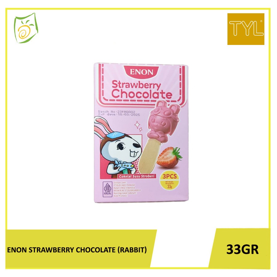 ENON Strawberry Chocolate (Rabbit) 33gr adalah camilan manis yang menggabungkan rasa cokelat lezat dengan sentuhan segar stroberi, dikemas dalam bentuk lucu dengan gambar kelinci (rabbit) yang menggemaskan. Setiap kemasan berisi 33 gram snack, yang memberikan porsi pas untuk sekali ngemil atau dinikmati saat santai.Camilan ini memiliki lapisan cokelat yang kaya dan halus, di dalamnya terdapat isian stroberi yang memberikan rasa buah yang segar dan sedikit asam, menciptakan perpaduan rasa yang sangat nikmat. Bentuk kemasan yang menggemaskan dengan karakter kelinci menambah daya tariknya, terutama bagi anak-anak yang suka dengan tampilan karakter lucu.