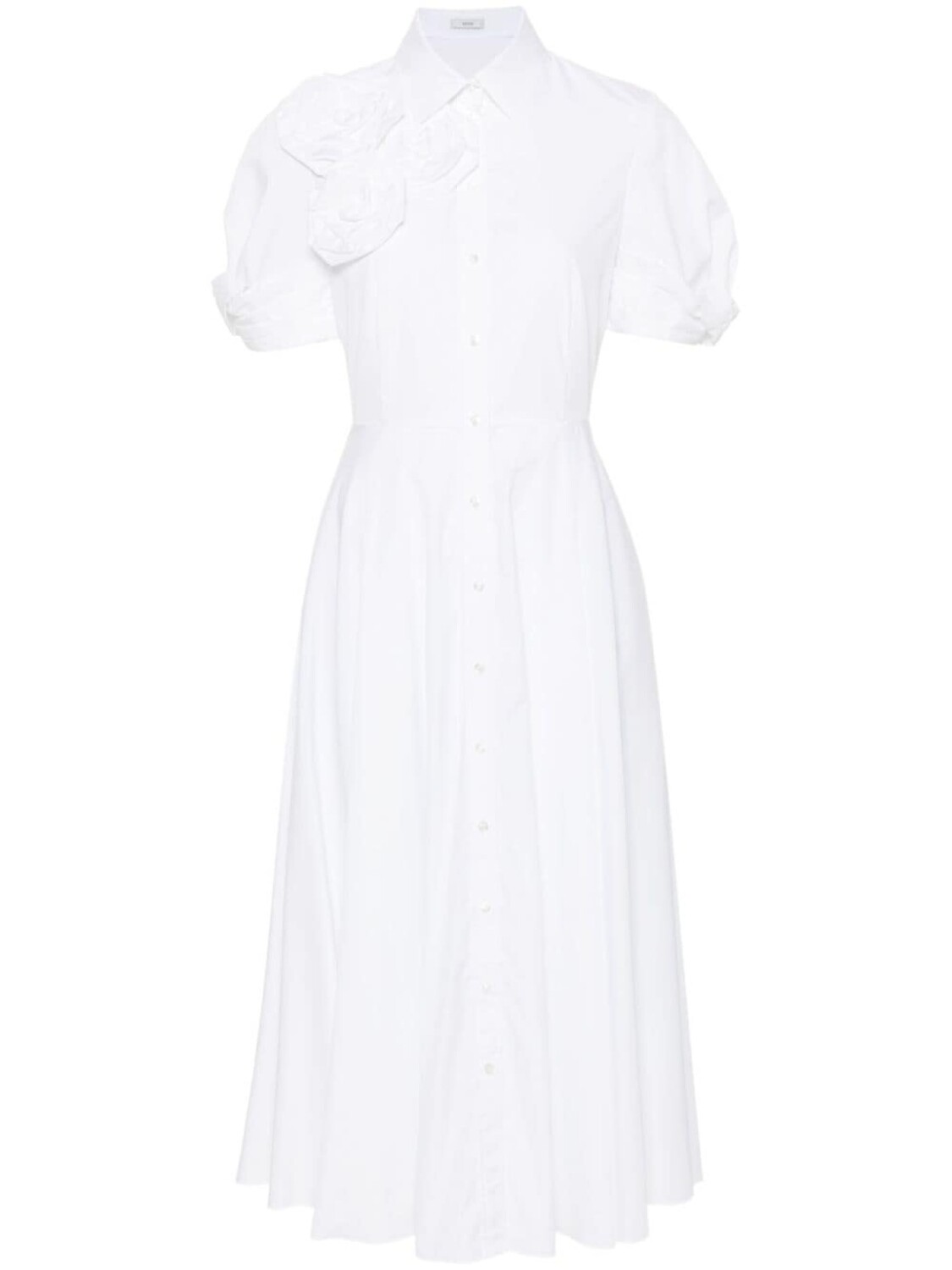 Подробнее о товаре: • белый • хлопок • поплин • аппликация в виде розы • защипы • складки • классический воротник • застежка на пуговицах спереди • короткие рукава • расклешенная юбка • два прорезных кармана по бокам • прямой подол • длина миди • модель без подкладки