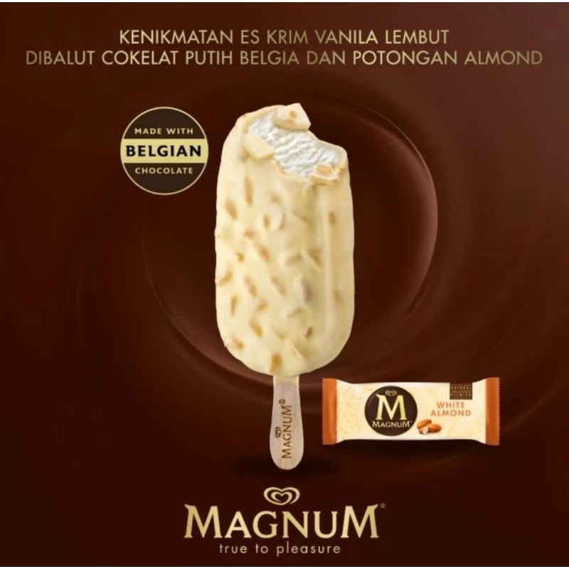 Nikmati kemewahan Magnum White Almond. Es krim vanilla yang lembut dilapisi cokelat putih Belgia yang tebal dengan kerenyahan kacang almond.