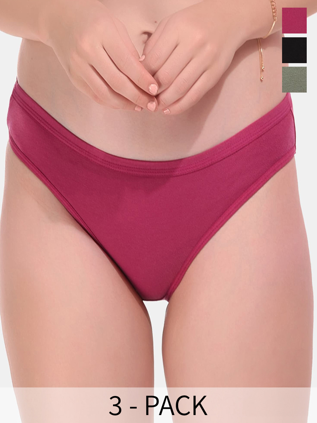 VAN Number: D.Pyaji Black Olive Panty-XSPack of 3 hipster briefs for womenMagenta solid mid-rise hipster briefs, has an outer elasticated waistband and a double layered contoured pouchGreen solid mid-rise hipster briefs, has an outer elasticated waistband and a double layered contoured pouchBlack solid mid-rise hipster briefs, has an outer elasticated waistband and a double layered contoured pouch