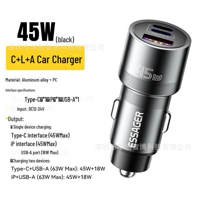 ESSAGER Серия Xuanyuan 45 Вт Автомобильное зарядное устройство: Адаптер быстрой зарядки с тремя портами C+L+A для мобильных телефонов. серый