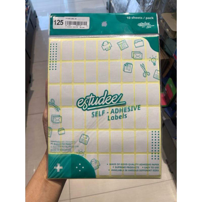 Stiker label Estudee tersedia ukuran 103, 121, 107, 99, 108, 109, 101, 112, 102, 123, 104, 127, 100, 105, 125, 120, 124, 126, 113, 111, 110.