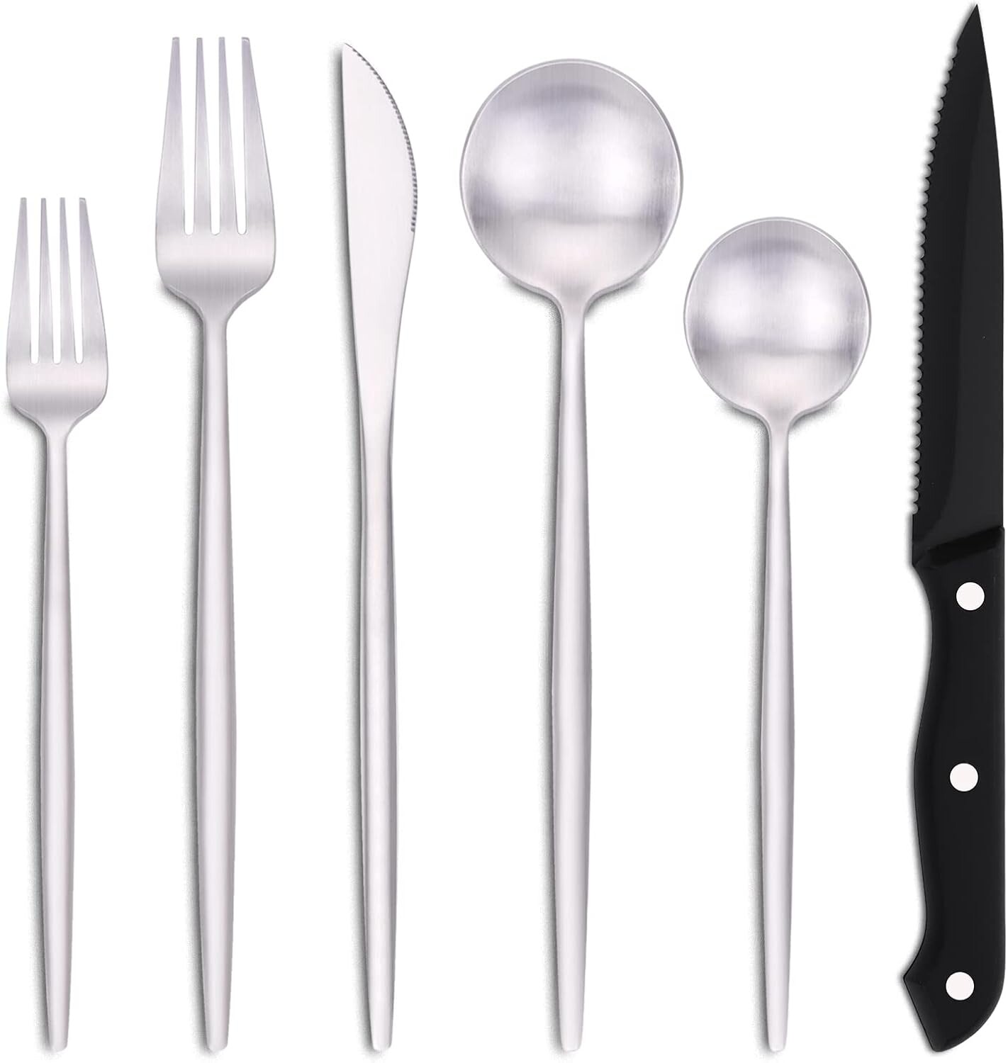 EUIRIO, набор из 24 матовых столовых приборов с ножами для стейка, набор столовых приборов из нержавеющей стали на 4 персоны, наборы столовых приборов, набор ложек и вилок, можно мыть в посудомоечной машине
