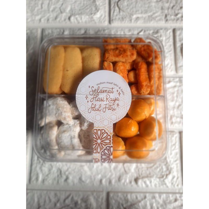* Terdiri dari empat macam kue: Nastar, Kastangel, Lidah Kucing, Putri Salju