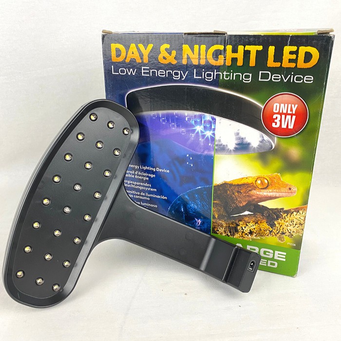 Convenient and energy efficient day & night lightingIdeal for reptiles and amphibians with NO UVB-requirementsAllows natural nighttime temperature dropsLong lifespanIncludes self-adhesive support-baseThe Exo Terra Day & Night LED is ideal for reptiles, amphibians andinvertebrates with NO UVB-requirements, like snakes, nocturnal geckos, frogs,newts, salamanders, spiders, scorpions, insects, etc. … The bright white LED’s(1) create a nice daylight, while the blue LED’s mimic a moonlight shimmer thatenable you to observe your animals at night without disturbing their naturalbehavior. The dim light of the blue LED’s allows nocturnal animals to navigatein their territory in search of insects, mating-partners, etc… whereas in totaldarkness they would be completely disoriented. Simply tap the Day/Night logotouch button (2) to switch from bright daylight to blue night light (3). The ExoTerra Day & Night LED is the most convenient and energy efficient way toilluminate your terrarium day & night. Conventional lightbulbs waste morethan 80% of the used energy in the form of heat, whereas the Exo Terra Day &Night LED illuminates your terrarium with a minimum of heat and a maximum oflight output. An almost complete absence of heat production reduces the risk ofoverheating during summer season and allows natural night time temperaturedrops. The LED’s in the Exo Terra Day & Night LED consume less energy andhave a longer lifespan compared to conventional incandescent and fluorescentlightbulbs.