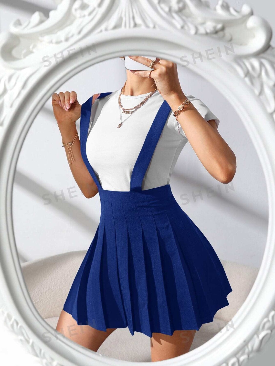 EZwear Однотонная плиссированная юбка, подтяжки Shein, темно-синий