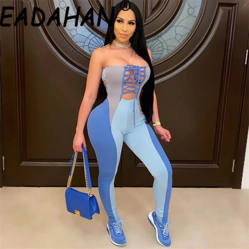 Eadahan 2021 Модный женский весенний сезон новые сексуальные сине-серые контрастные цветные на шнуровке с лямкой на шее облегающие брюки