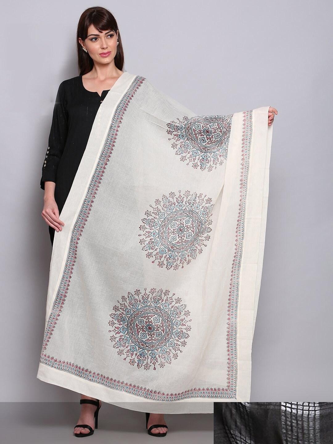Miaz Lifestyle Women White & Black Woven Design Cotton Silk Dupatta with Gotta Patti
