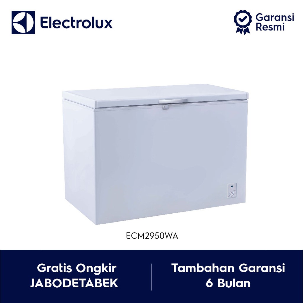 Free biaya kirim untuk area kirim Jabodetabek dengan menggunakan armada Electrolux. (Free biaya kirim tidak berlaku di luar Jabodetabek)Deskripsi Chest Freezer ELECTROLUX :Feature :- KapasitasECM2950WA (250Liter)- warna Putih- Daya maksimal 120watt- Feature Vacuum udara dalam box Freezer setiap aliran listrik dinyalakan agar udara dingin tetap konstan pada saat unit digunakan- Terdapat inner sliding glass door- Sangat baik untuk mempertahankan udara dingin didalam box freezer- Freon menggunakan R600a- Garansi Resmi PT.ELECTROLUX INDONESIA- Free Delivery untuk pengiriman area Jabodetabek dengan menggunakan jasa kirim armada PT.ELECTROLUX INDONESIA