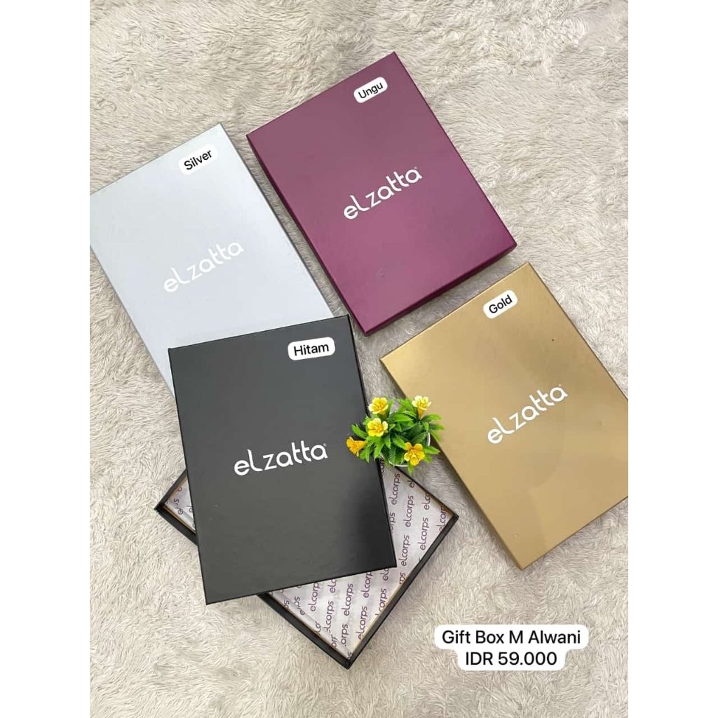 Kotak Kado berbahan tebal dan kokoh, bertuliskan "Elzatta". Cocok sebagai kado atau bingkisan berisi baju atau jilbab.