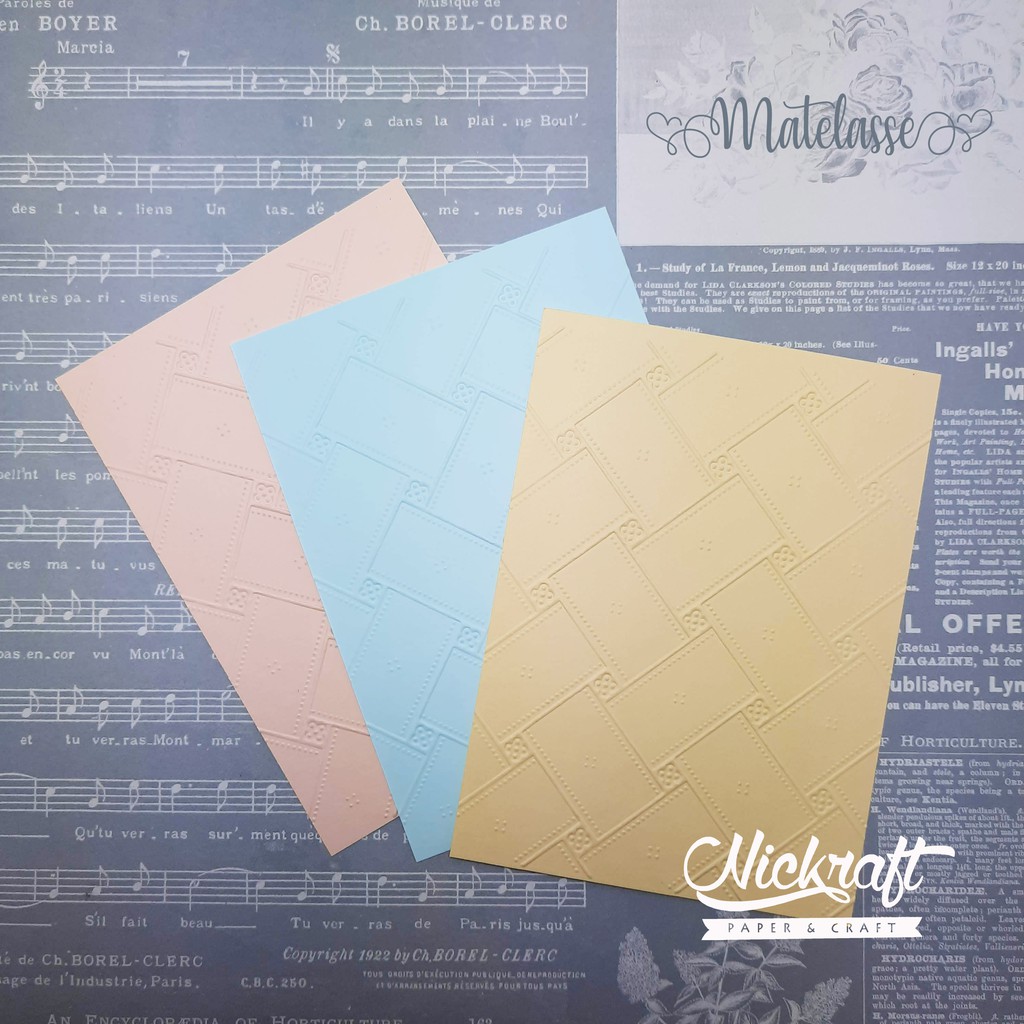 Kertas dengan motif timbul yang dapat digunakan untuk membuat kartu ucapan, undangan, cover, scrap, maupun prakarya kertas lainnya.