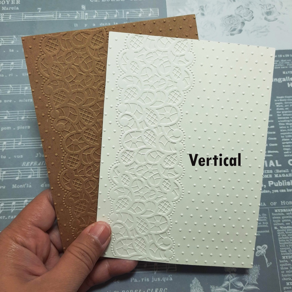 Kertas dengan motif timbul yang dapat digunakan untuk membuat kartu ucapan, undangan, cover, scrap, maupun prakarya kertas lainnya.