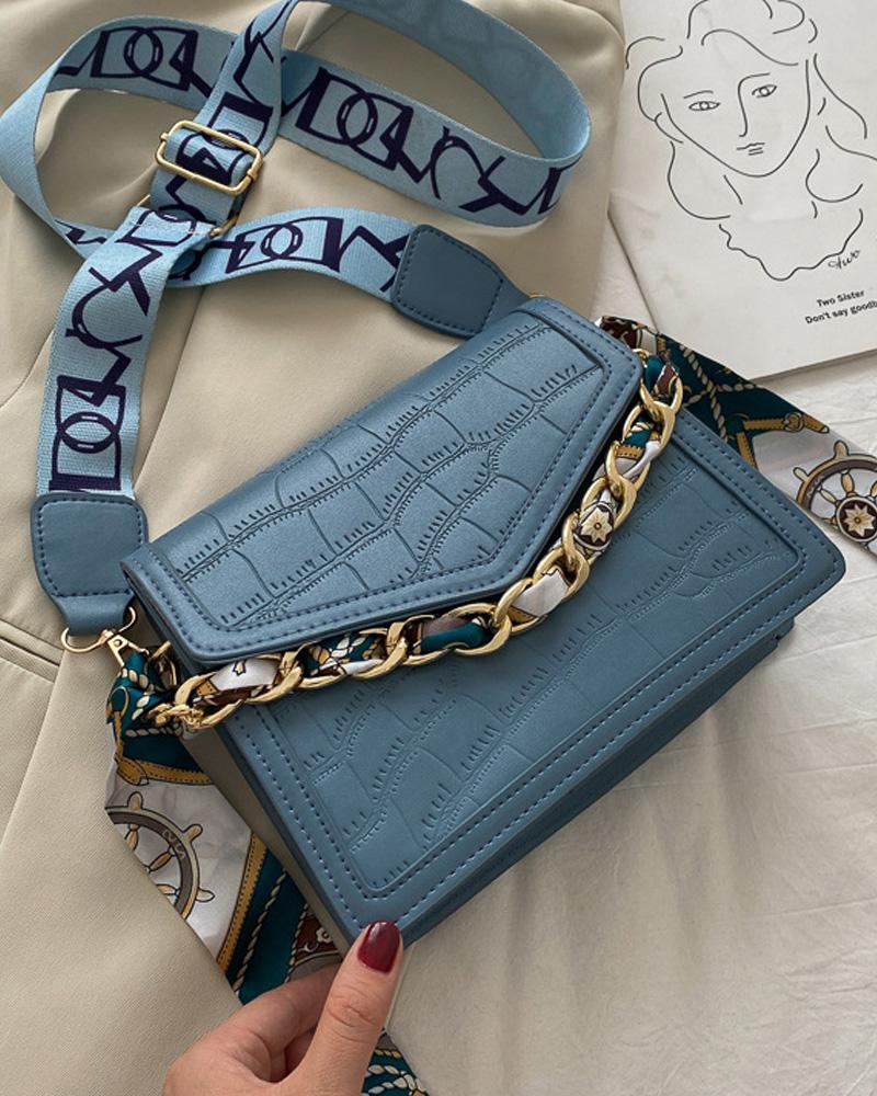 Embossed Chain Decor Flap Shoulder Bag, Blue