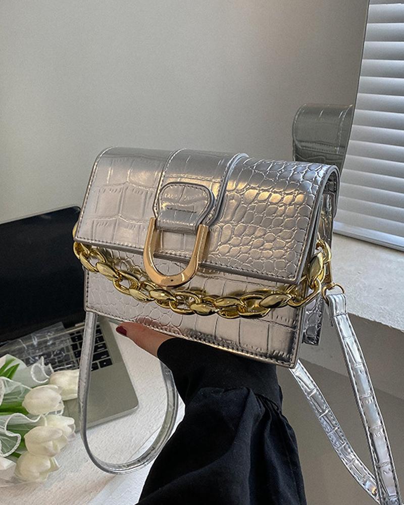 Embossed Chain Decor Flap Shoulder Bag, Silver