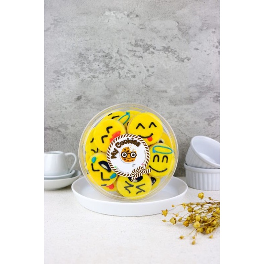 Emoji cookies adalah kue kering yang renyah dengan topping icing sugar manis di atasnya yang dihias menjadi bentuk emoji, cocok untuk anak-anak