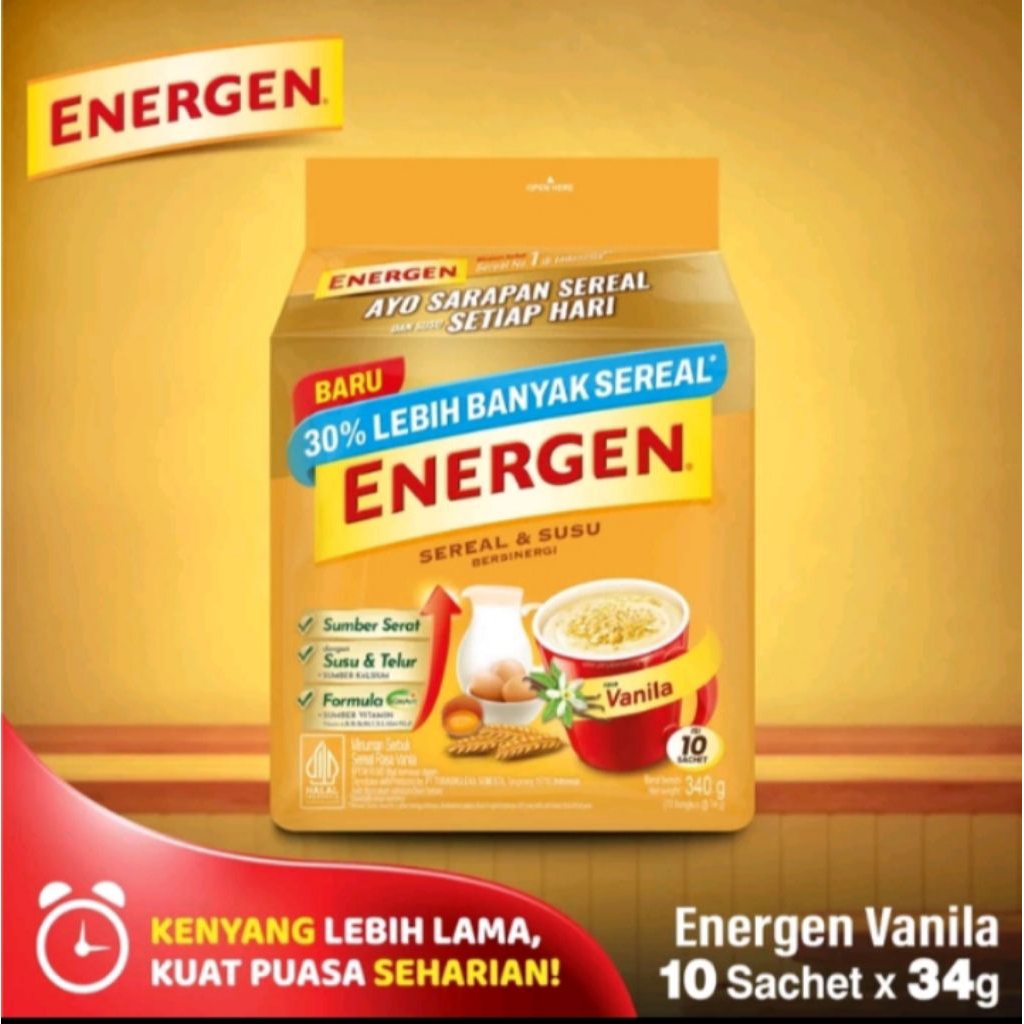 Dengan kandungan susu, telur, sereal, dan gandum, Energen Vanilla memberikan