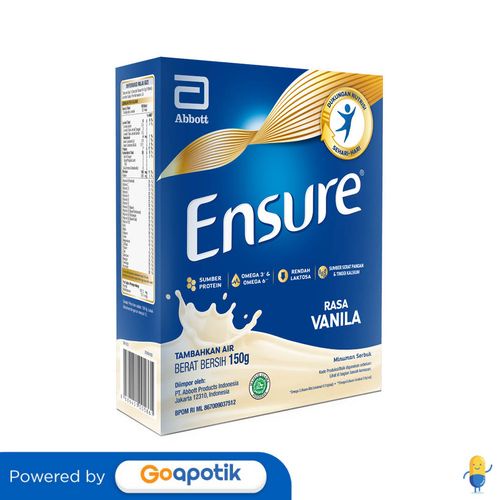 Deskripsi: Ensure adalah dukungan nutrisi sehari -sehari dengan Triple Protein untuk menjaga daya tahan tubuh dan kekuatan untuk sepanjang aktif | Komposisi: Triple Protein ,Sumber Vitamin D & Tinggi Kalsium, Sumber 14 Vitamin dan 10 Mineral, termasuk Vitamin A, Vitamin C, Vitamin E, Zink, dan Selenium, Omega 3 (Asam Alfa Linolenat 0.11 g/ saji) dan Omega 6 (Asam Linoleat 0.9 g/ saji), Rendah Laktosa | Dosis: Ensure dapat diberikan 1-2 gelas sehari. | Indikasi: Ensure adalah dukungan nutrisi sehari -sehari dengan Triple Protein untuk menjaga daya tahan tubuh dan kekuatan untuk sepanjang aktif | Perhatian Khusus: PERINGATAN: